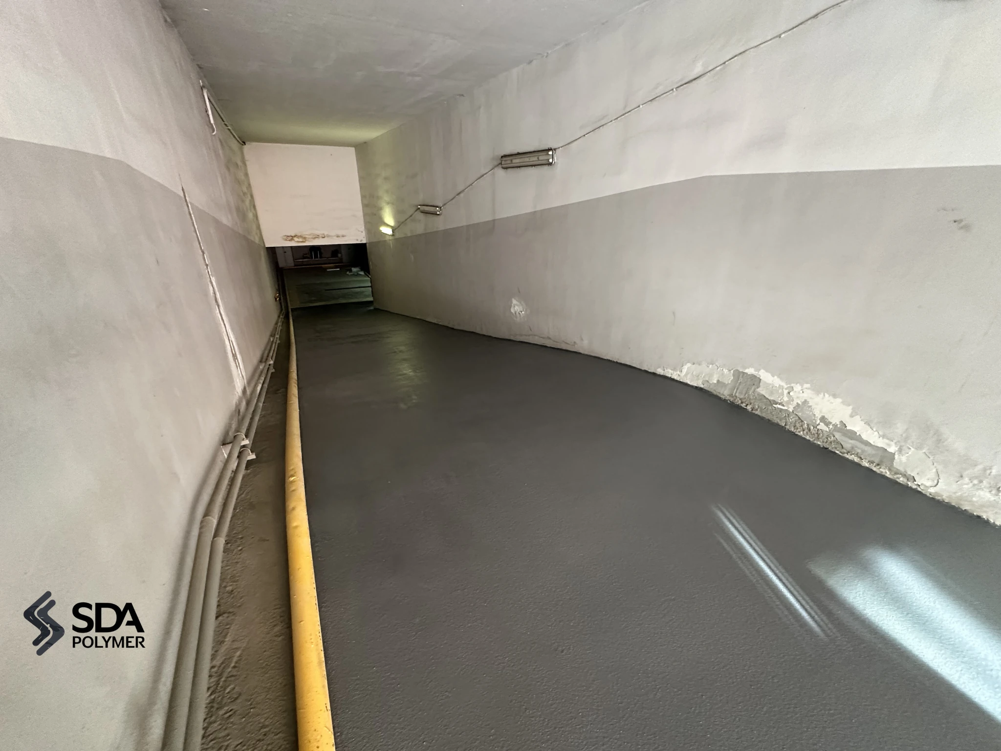 Расшивка трещин, шпаклевание выбоин, устранение дефектов полимербетоном вдоль стен.